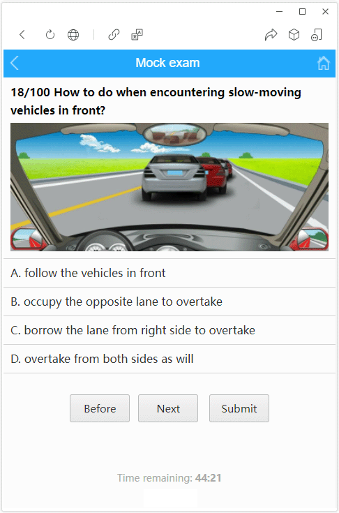 3. Mock exam:Randomly select 100 questions for the exam according to the exam rules. The exam will last for 45 minutes, with 1 point for each question. Candidates who score 90 or above will pass.