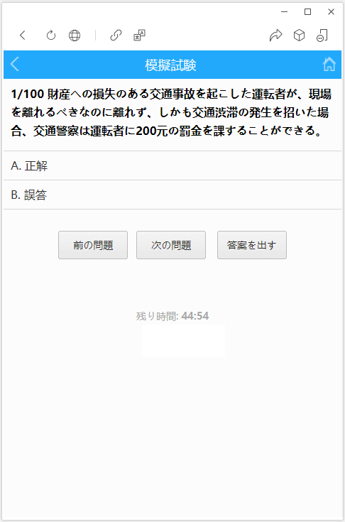模拟测试:按考试规则随机抽取100题考试,考试时间45分钟,每题1分,90分及以上合格。